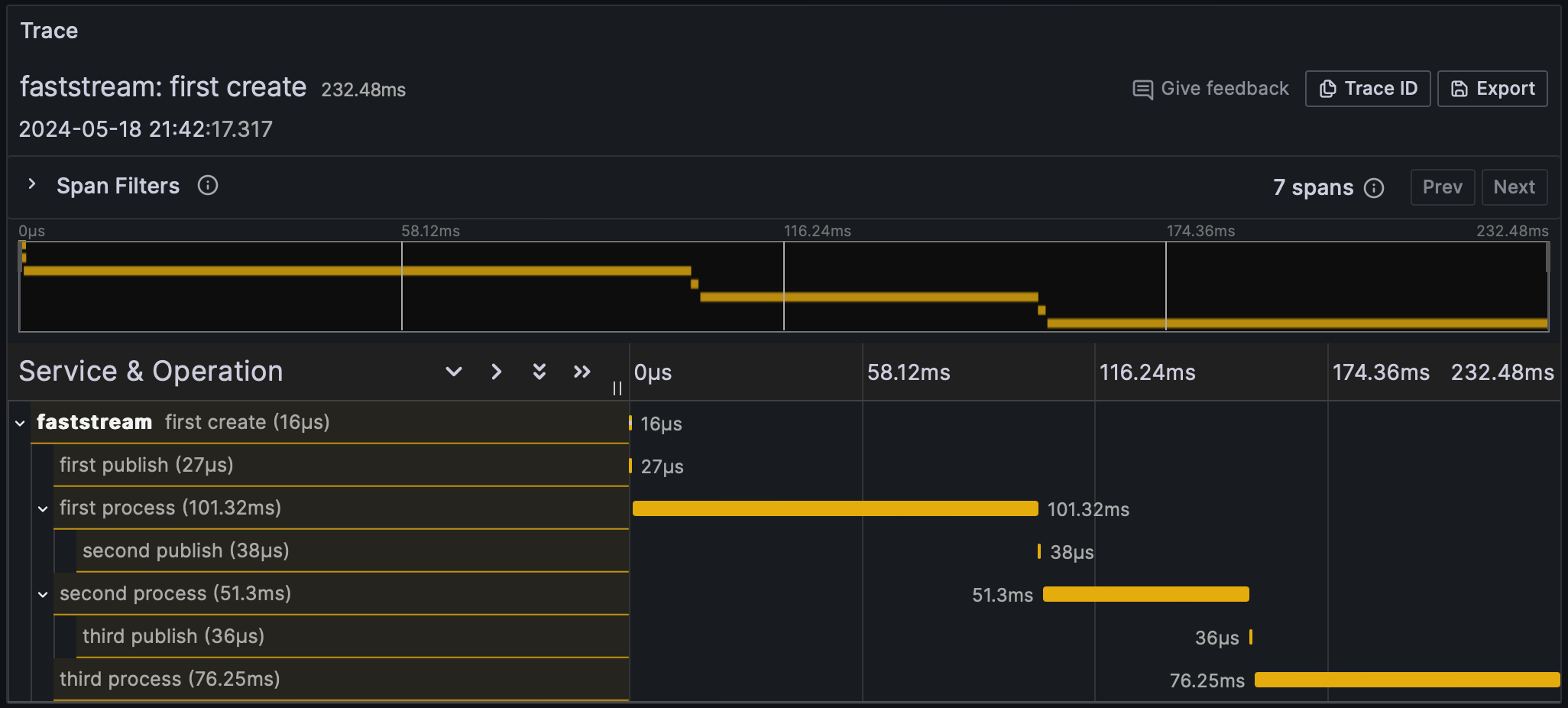 OpenTelemetry tracing support in FastStream adheres to the semantic conventions for messaging systems.